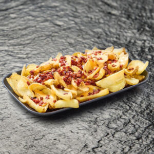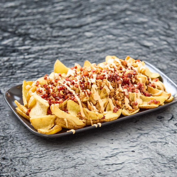 Patatas fry’n dip crujientes bañadas en salsa cheddar y tips de bacon.