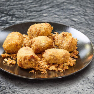 6 croquetas crujientes, con su relleno cremoso de buey a la brasa.