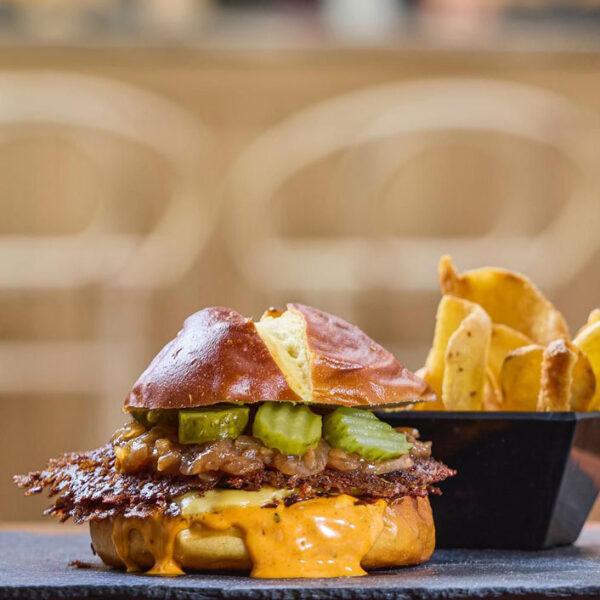 Pan brioche, carne de buey madurado con queso cheddar, cebolla, pepinillos agridulces, lechuga en juliana y salsa burger.