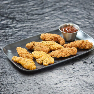 8 tiras de pollo caseras, hechas a diario con su rebozado crujiente acompañadas de su salsa BBQ o Miel y mostaza a elegir.