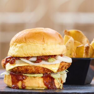 Pan brioche, contramuslo de pollo con su rebozado crujiente, queso monterrey jack, lechuga, cebolla dulce y su salsa BBQ BULLS EYE.