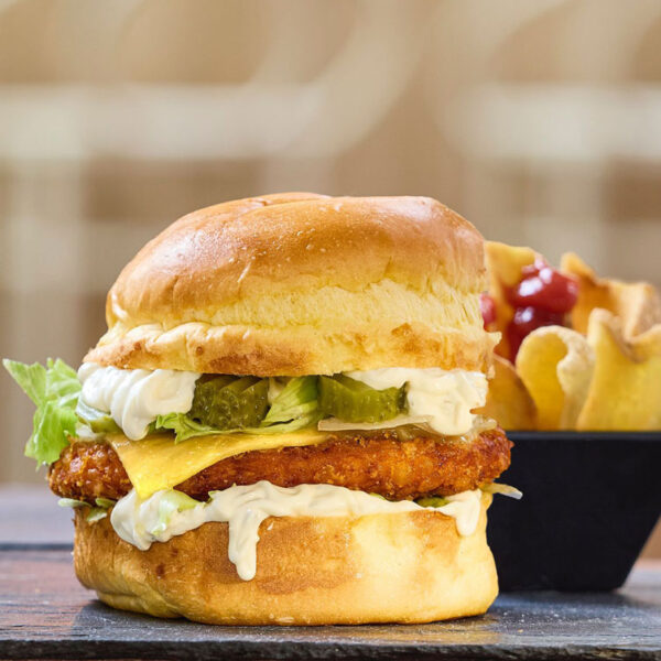 Pan brioche, contramuslo de pollo con su rebozado crujiente, queso monterrey jack, lechuga en tiras, pepinillo agridulce y su salsa de mahonesa con cebolla caramelizada y ajo.
