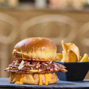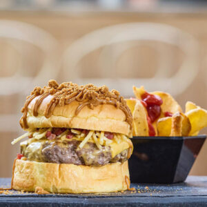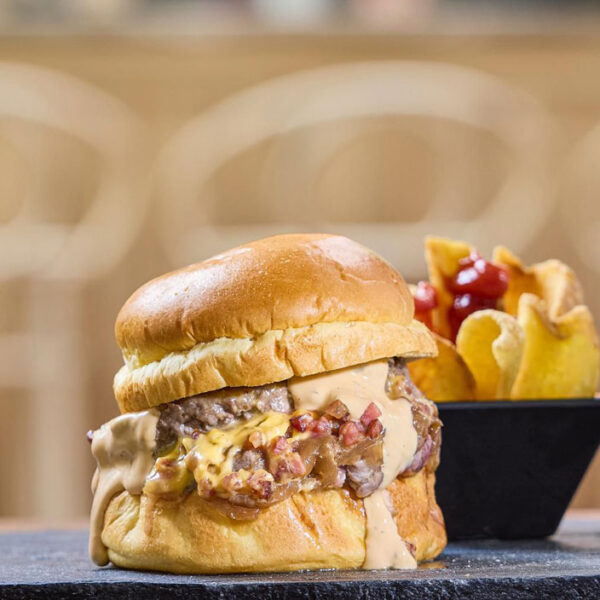 Pan brioche, carne de chuletón rellena de queso cheddar, tips de bacon crujiente, cebolla caramelizada y salsa baconnaise
