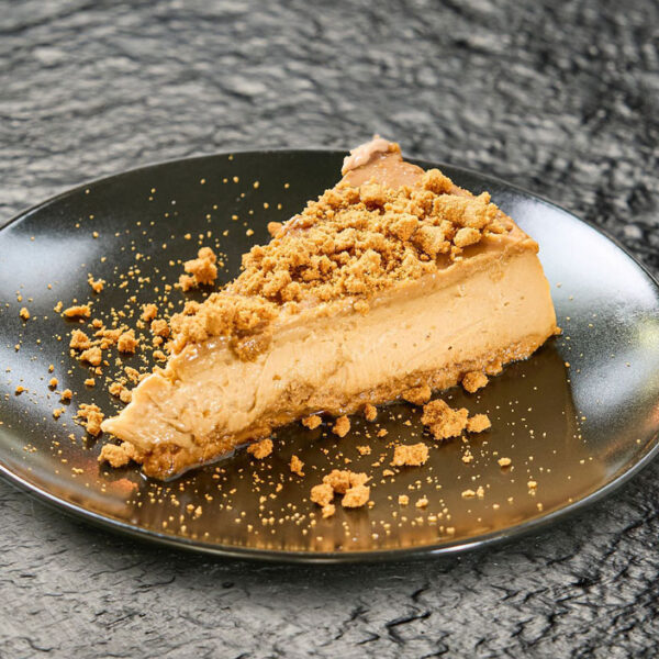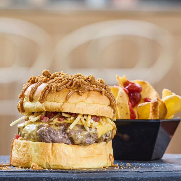 Pan brioche, carne de buey madurada, queso cheddar, crujiente de bacon, patatas paja con un crunch de galleta picada y su salsa lotus.