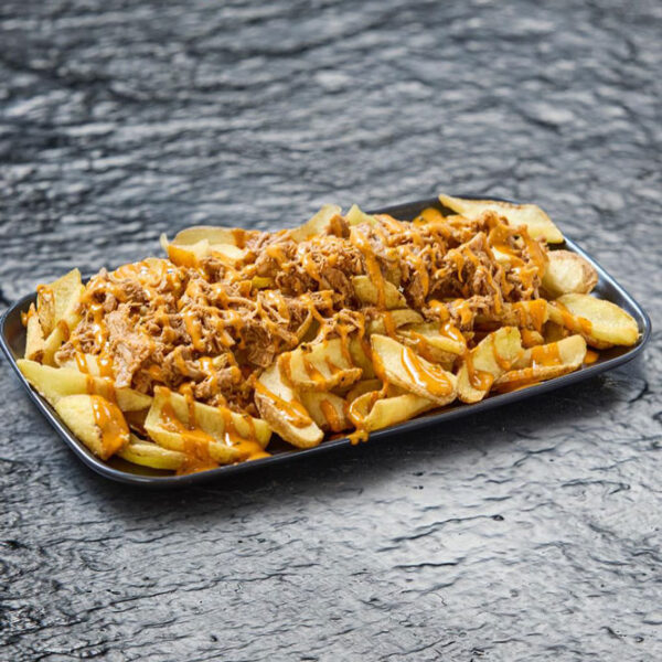 Patatas fry’n dip crujientes bañadas en salsa emmy y pulled pork BBQ.