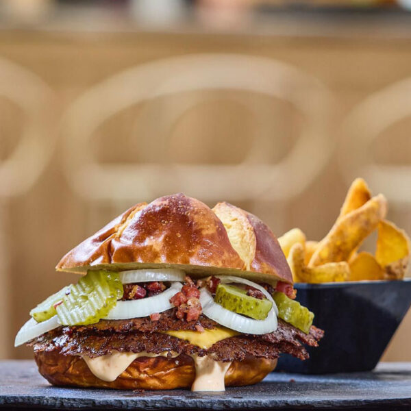 Pan bretzel, carne de vaca, queso cheddar madurado en chili, cebolla frita, pepinillo encurtido, mermelada de bacon y salsa secreta.