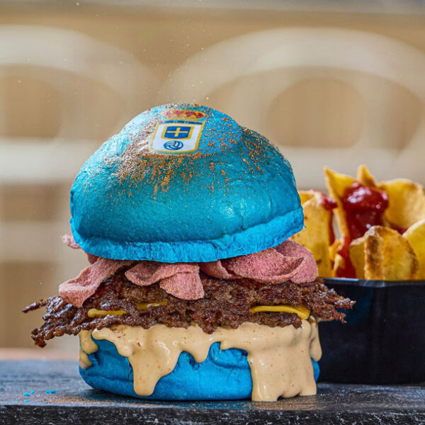 Pan brioch azul con mantequilla coronado con oro. Mermelada de bacon by Thevizvan. Pepinillo encurtido. Gublins de bacon. Y nuestra salsa secreta Thevizvan